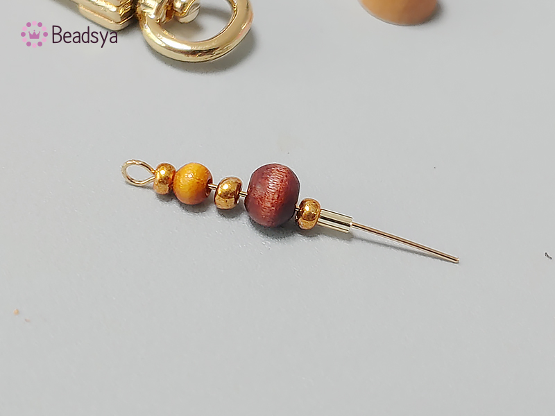 그리고 중간중간에 뜬 부분을 깔끔하게 마감하기 위해 금색 시드비즈를 큰 우드비즈 사이사이에 하나씩 꿰어 단단하게 고정하는 작업을 진행해보겠습니다.