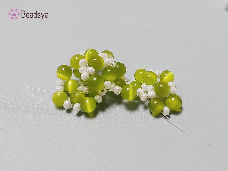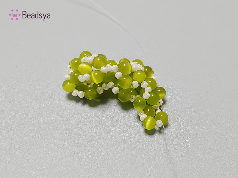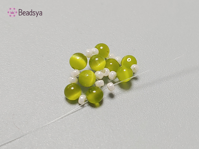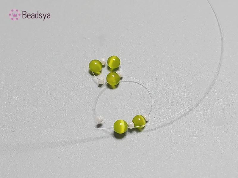 낚시줄은 생각보다 많이 필요해 길게 뽑았어요 ^^ 그리고 위 사진 처럼 캣츠아이 > 시드비즈 순으로 꿰주다 캣츠아이 하나로 교차해주면서 콩깍지 부분 제작이 시작되겠습니다.