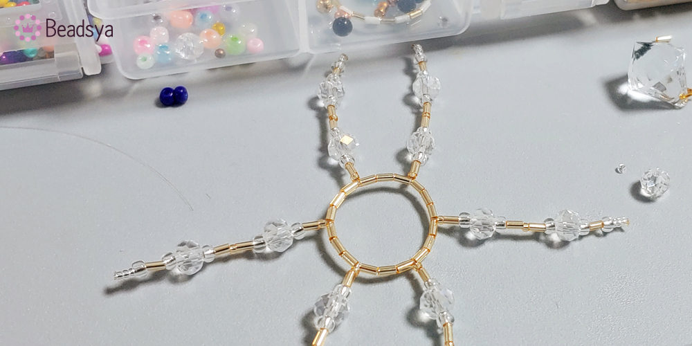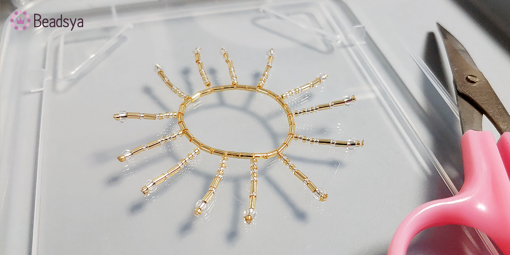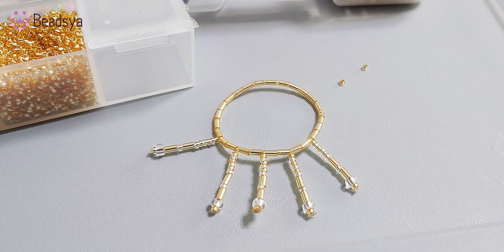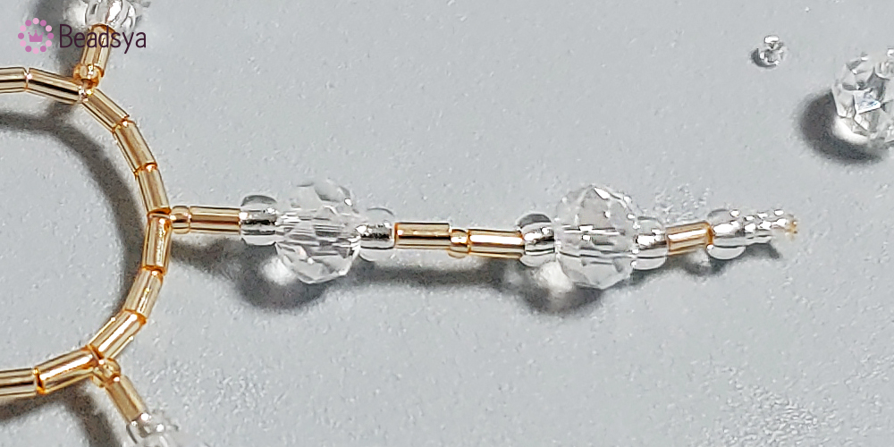 이번에도 순서를 말씀 드리자면.... 1.5mm 시드비즈 3개 > 3mm 시드비즈 > 1.5mm 빨대비즈 > 3mm 시드비즈 > 6mm 론델컷 비즈 > 3mm 시드비즈 > 1.5mm 빨대비즈 > 1.5mm 시드비즈 > 1.5mm 빨대비즈 > 3mm 시드비즈 > 6mm 론델컷 비즈 > 3mm 시드비즈 > 1.5mm 빨대비즈 > 1.5mm 시드비즈.... 입니다.. 헉헉;;; 이번 작업은 아까 큰 링 작업보다는 좁기때문에 3칸에 하나씩 장식을 달아주었습니다.