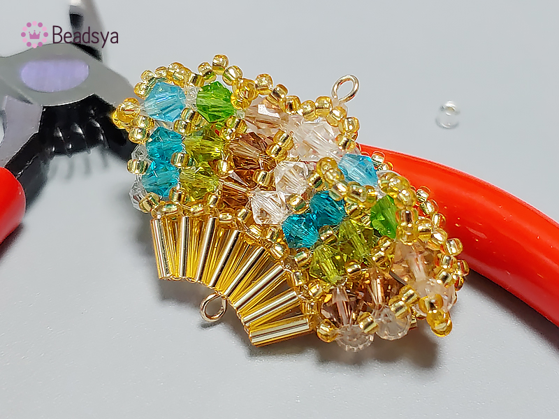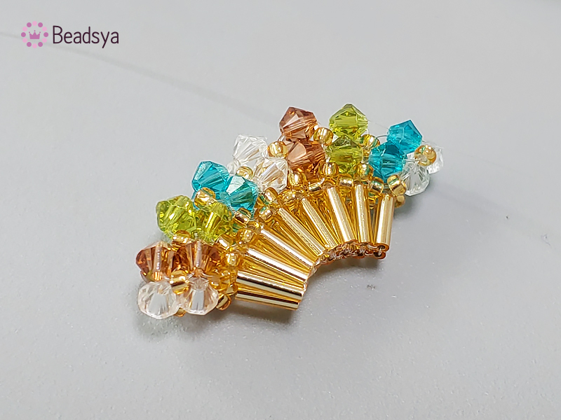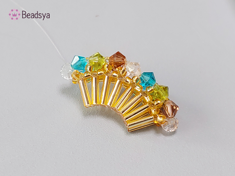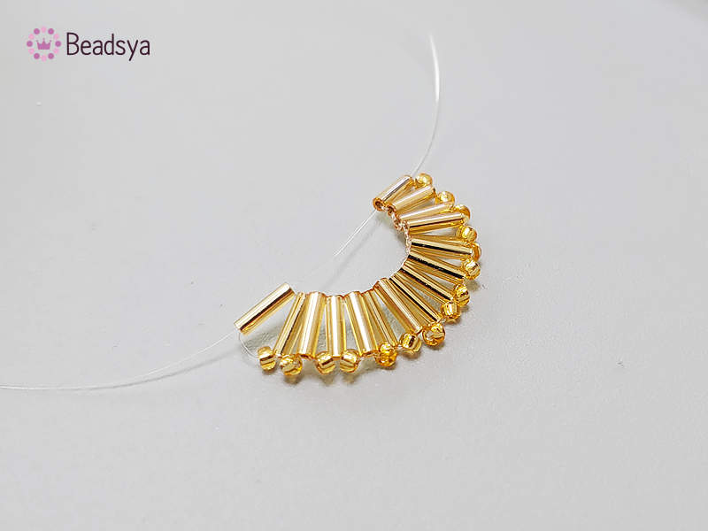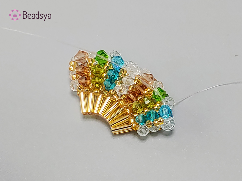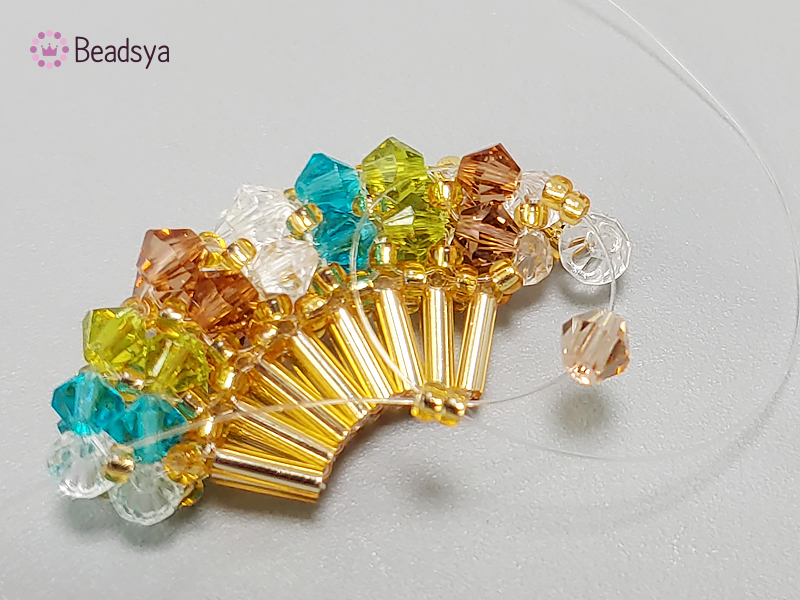 처음 교차 다음에는 시드비즈 방향으로 나온 낚시줄에 시드비즈 > 빨대비즈(교차)로 계속 이어가면 위 사진과 같이 넓게 퍼진 부채꼴 모양이 완성됩니다. 신기하죠? ㅎㅎㅎㅎ
